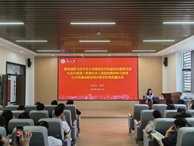开班仪式后,贵州大学纪委副书记张妤以《深学细悟习近平关于加强党的作风建设的重要论述 扎实开展深入贯彻中央八项规定精神学习教育 以作风建设新成效护航学校高质量发展》为题,从深学笃行习近平总书记关于加强党的作风建设的重要论述、锲而不舍落实和准确把握中央八项规定精神核心要义和精神实质以及如何扎实开展深入贯彻中央八项规定精神学习教育和推动作风建设走深走实三个方面进行讲授。整场专题辅导报告会既有理论高度,又有具体案例,对深入贯彻中央八项规定精神学习教育具有很强的针对性和指导性。