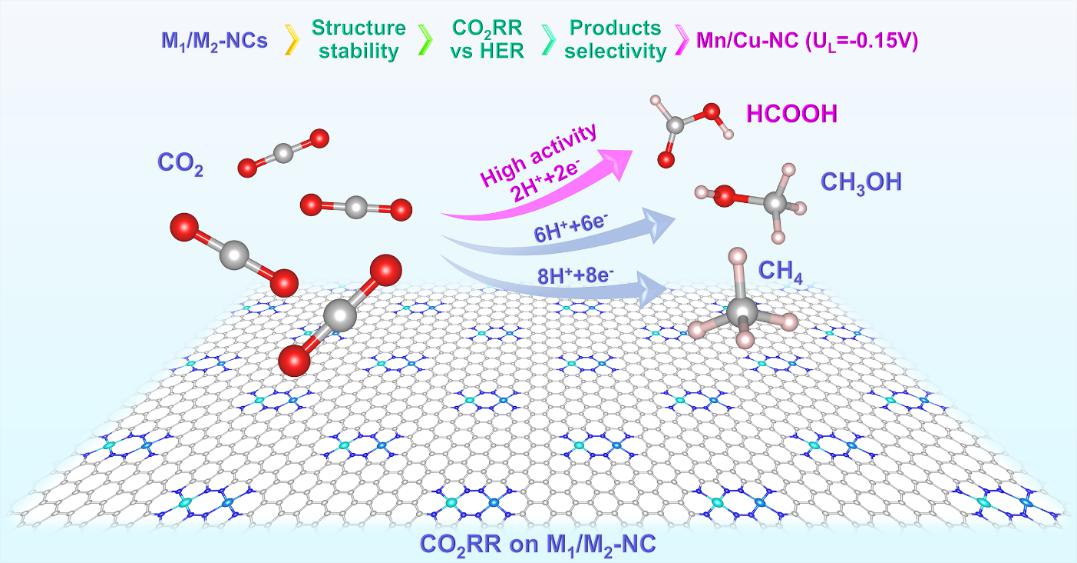 近日,贵州大学化学与化工学院朱纯/梁锦霞教授理论与计算化学课题组采用第一性原理计算方法设计并系统研究了一系列石墨烯基双金属原子催化剂(M1/M2-NC)的稳定性、及其电催化CO2RR的活性和产物选择性。研究结果表明,Mn/Cu-NC双金属原子催化剂在电催化CO2RR生成甲酸(HCOOH)过程中展现出显著优势,其极限电位低至−0.15 V。进一步理论分析表明,该催化剂优异性能的形成主要归因于以下两个方面:一是Mn/Cu-NC中Mn和Cu双原子之间的d-d电子耦合作用,这种作用使得Mn单原子的d带中心上移并接近费米能级,从而显著增强了反应体系的电荷转移效率;二是关键中间体*OCHO在Mn活性位点的吸附能力的增强。这两方面的协同效应有效降低了CO2RR的反应能垒,进而显著提升了Mn/Cu-NC的催化性能。这项工作预测了一种新型双原子催化剂Mn/Cu-NC并对其在电催化CO2RR中的作用机制提供了深入的理论见解。