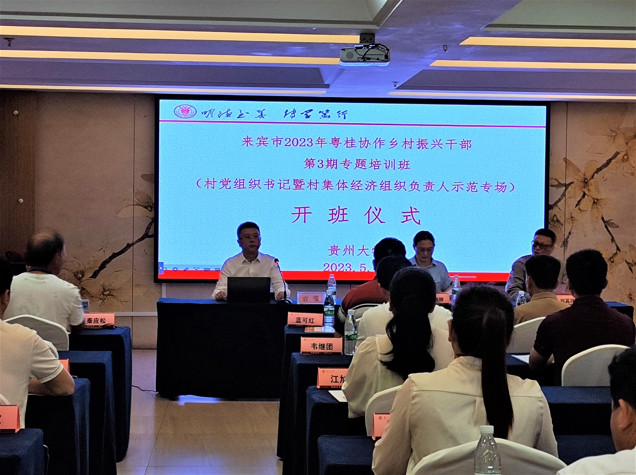 5月22日上午,来宾市2023年粤桂协作乡村振兴干部第3期专题培训班(村党组织书记暨村集体经济组织负责人示范专场)开班。学院教育培训中心副主任官莹致欢迎辞,来宾市乡村振兴局权艳柳领队讲话提出培训要求。