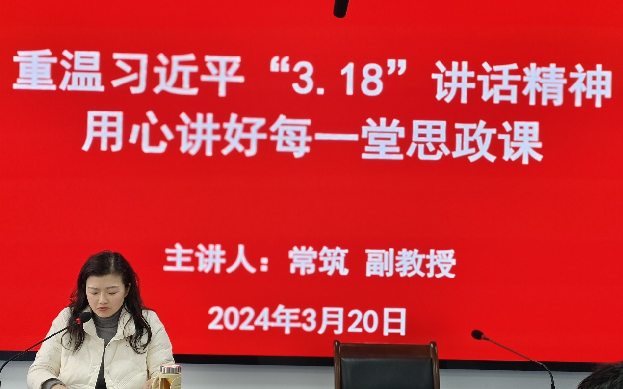 常筑以“重温习近平总书记‘3·18’重要讲话精神、用心讲好每一堂思政课”为题做宣讲,她从犯罪低龄化现象强调思政课程的重要性,结合习近平总书记提出对思政课教师综合素质的“六个要”,介绍了高校思政课程体系改革的有关情况,并根据自身多年思政课教学的经验方法,分享了自己如何践行习近平总书记提出的思政课程“八个统一”要求。