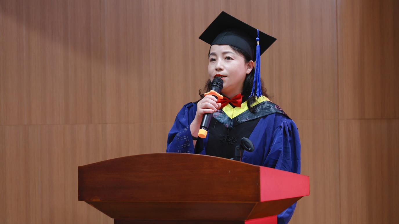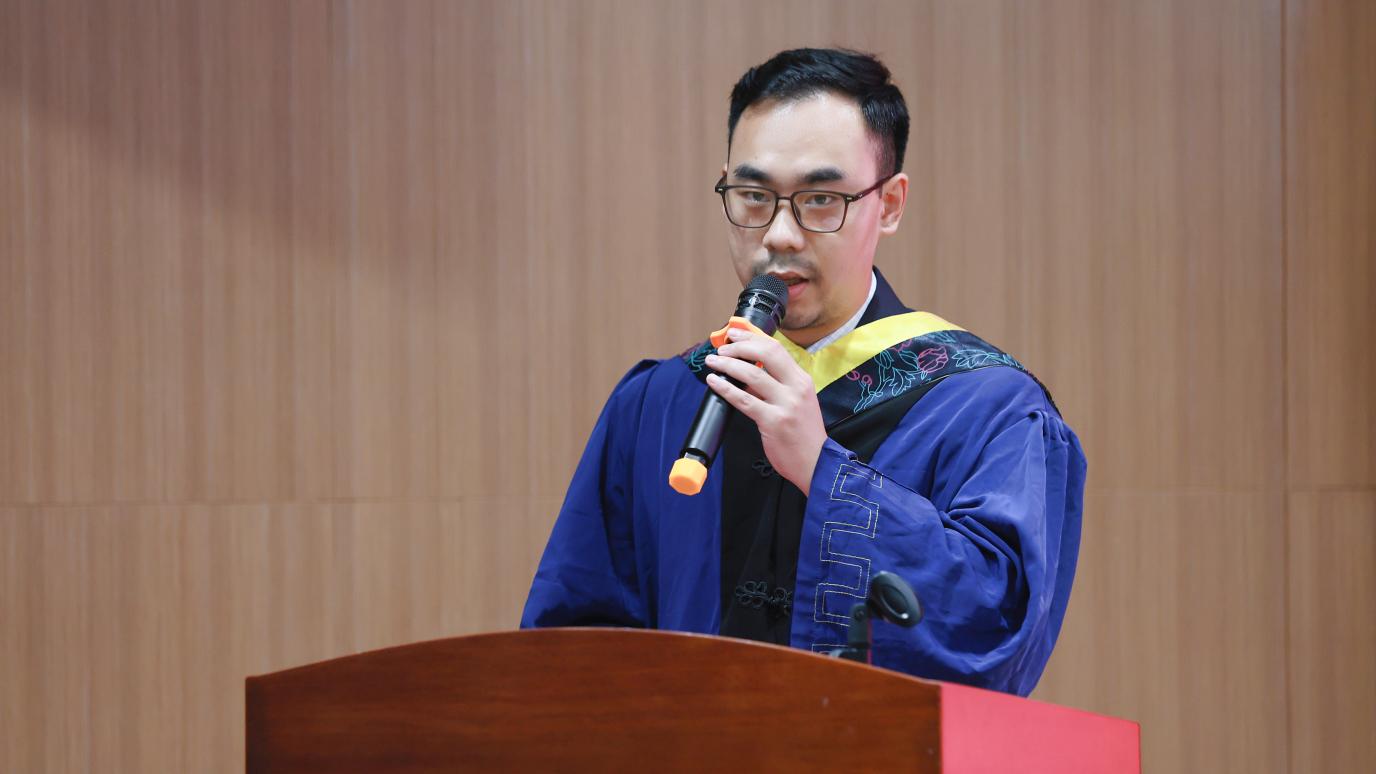 最后是毕业生黄婷婷和王鹏代表2021级毕业生发表感言。黄婷婷同学表示她被现场播放的班级回忆录深深的感动了,对其在MPM学习过程的点滴进行回顾,对母校、学院和老师们致谢,并对毕业生们送出祝福;王鹏同学全程英文发言,慷慨激昂,以“明德至善,博学笃行”为引,表示要继续秉承贵州大学的优良传统,坚守初心,砥砺前行,将所学知识运用到实际工作中,为国家的繁荣富强贡献自己的力量。