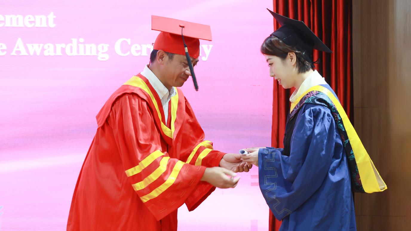 典礼第二阶段,白林立书记宣读获得荣誉证书学生名单,谢黎副院长主持颁发荣誉证书。洪云处长、Marie-Anne Blackburn副处长为成绩优异,班级排名前六名的同学颁发优秀学生奖;任康民院长、李珂先生为极具班级责任感和荣誉感,积极组织策划班级活动的班干颁发优秀班干奖;洪峰会长、黄剑副处长为善于发现和解决问题,在班级发展中作出了贡献的同学颁发班级贡献奖。