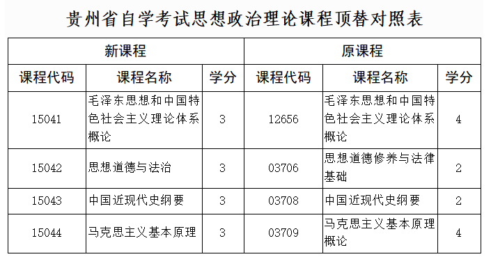 在籍未毕业的自学考试考生,已取得的思想政治理论课程合格成绩及学分继续有效。已取得现行的“毛泽东思想和中国特色社会主义理论体系概论”(课程代码12656,4学分)、“思想道德修养与法律基础”(课程代码03706,2学分)、“中国近现代史纲要”(课程代码03708,2学分)、“马克思主义基本原理概论”(课程代码03709,4学分)等4门思想政治理论课程合格成绩和学分的考生,可对应顶替调整后的思想政治理论课程,无需再参加调整后的相对应课程考试。课程对应顶替关系如表所示: