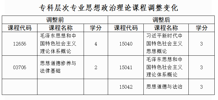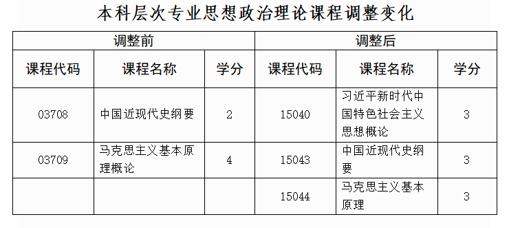 调整后的自学考试专、本科层次专业思想政治理论课均设置3门课程,共9学分。调整变化如表所示: