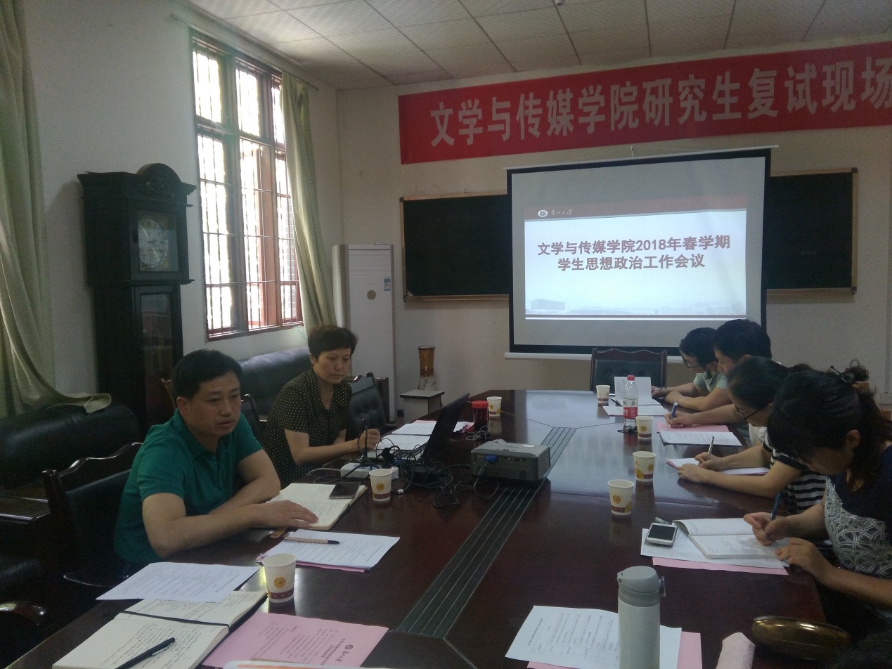 (学生科 吴卿 摄影/报道)2018年5月17日上午10点,文学与传媒学院在人文楼202会议室召开2018年上半年学生思想政治工作会议。学院党委书记罗卫刚,副书记董蔚然,学生科辅导员吴卿、王婷婷,成长导师姚亮、郑国周、李箐、明月熙、张波、杨世海、吴研参会。学生科辅导员王婷婷主持会议。