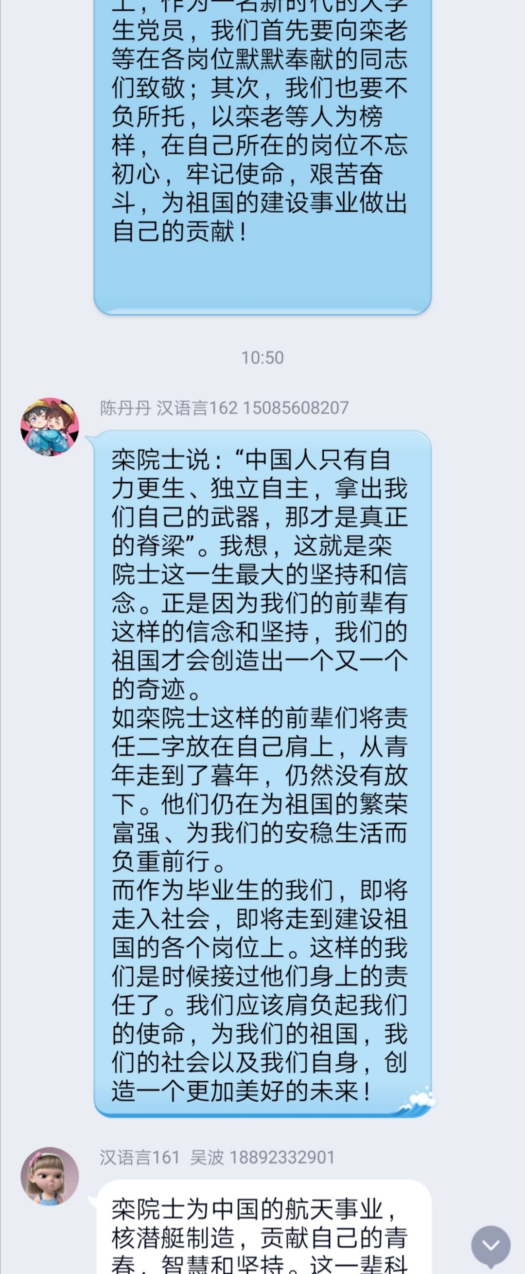 栾恩杰院士对母校的感恩表达激起了大家内心对我校的感恩之情,大家表示,“今天我以母校为荣,明天母校以我为荣”,感谢学校的悉心培养、关心与帮助、支持与付出,未来走出社会以后,会更好地坚守岗位,不辜负学校的栽培与支持。此外,“中国人只有自力更生,独立自主,拿出自己的武器,那才是真正的脊梁”充分引起了大家的共情,大家都认为,“自立自强”、“自力更生”是亘久不变的硬道理,是中华民族和中国人民的重要精神品质,也是我国能屹立于世界民族之林的重要保证。陈丹丹说:正是因为我们的前辈有这样的信念和坚持,我们的祖国才会创造出一个又一个的奇迹。大家还表示,从栾院士的身上看到了深厚的爱国之情,能够始终保持艰苦奋斗、刻苦钻研的精神奋战在航天一线,源于栾老对国家、民族的深重情怀。宋玉琳说:栾院士是我们的榜样,我们应该把自己的学习成长同党和国家的事业,社会和人民的需要结合起来,勇于创新,艰苦奋斗!