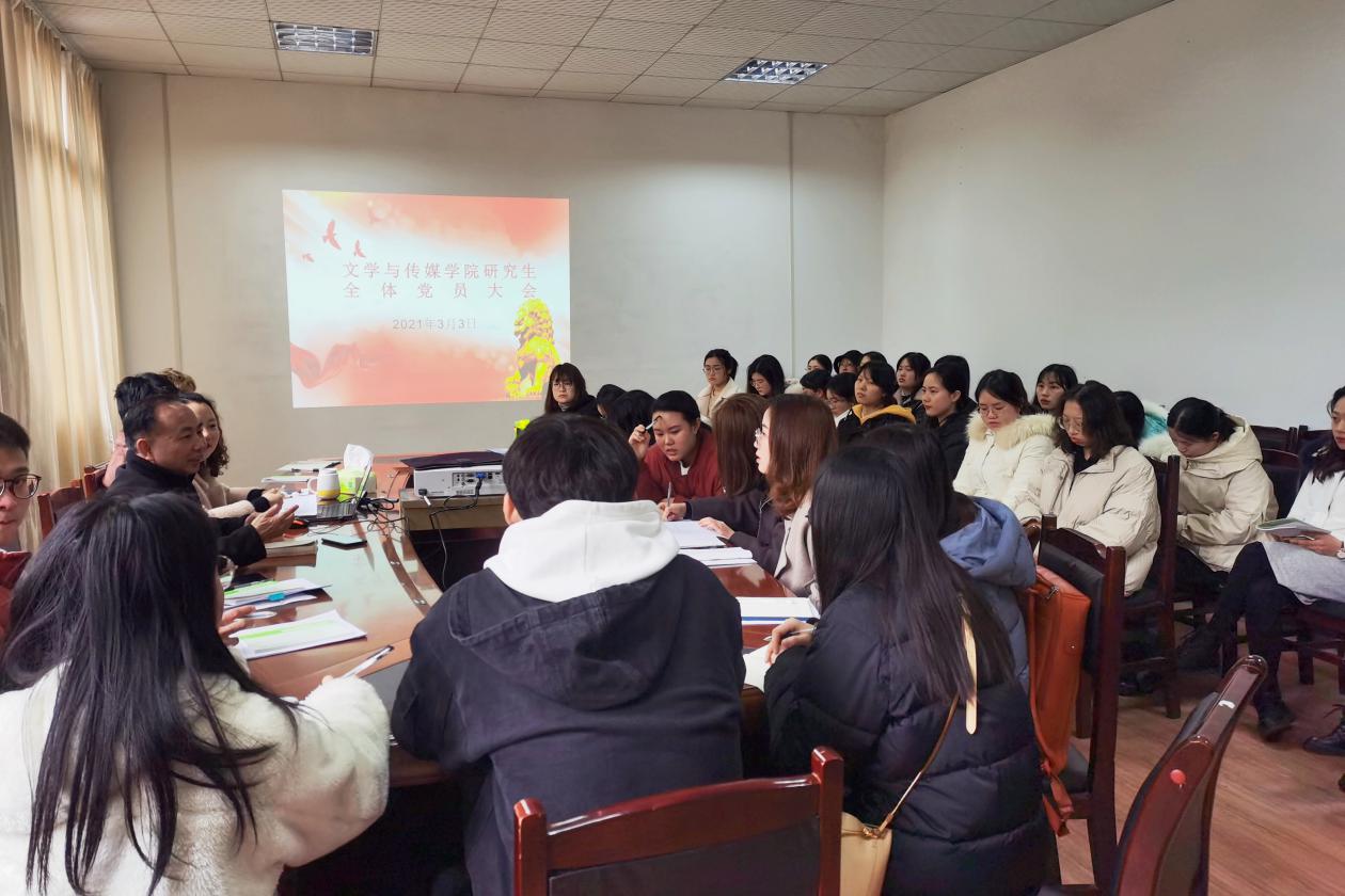 2021年3月3日下午,贵州大学文学与传媒学院研究生党员大会在人文楼204会议室召开,院党委书记李开学出席此次会议,研究生第一、第二党支部全体党员同志参会。会议由院党委组织员姬丹主持。