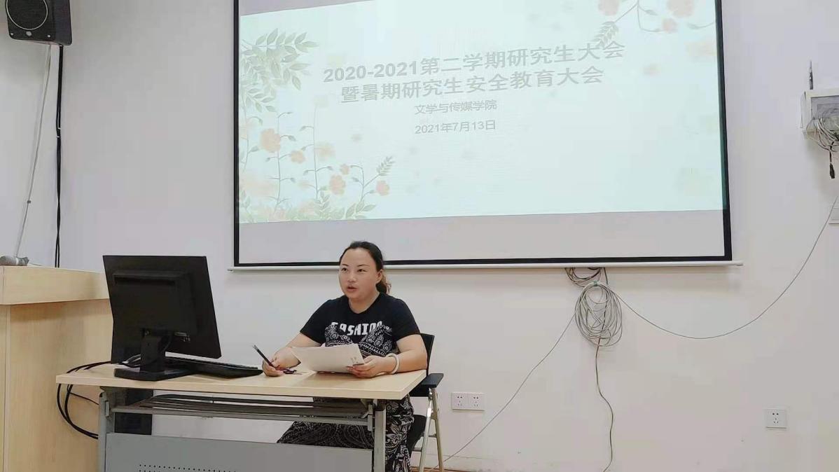 2021年7月13日上午,文学与传媒学院在人文楼103室召开2020-2021第二学期研究生大会暨暑期研究生安全教育大会。会议由文学与传媒学院研究生辅导员姬丹主持,学院2019级、2020级全体研究生参会。