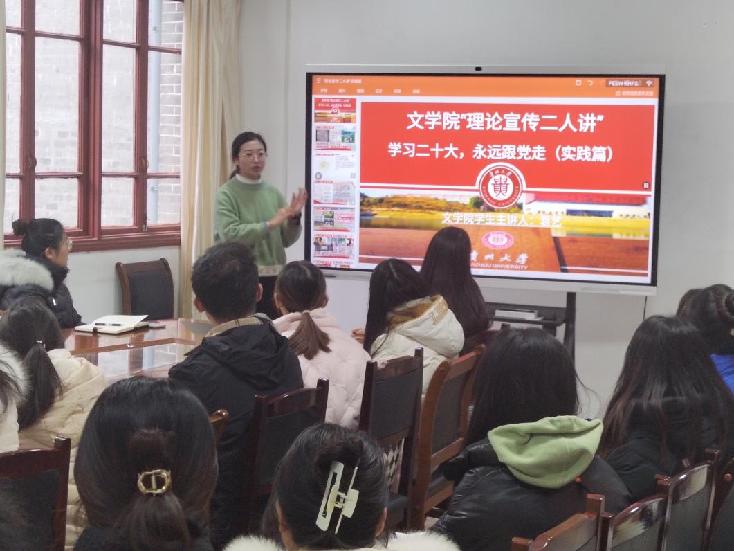 根据校党委2023年9月8日印发的《关于在全校开展新时代党的创新理论“理论宣传二人讲”宣讲的通知》,为促进我院学子深入了解新时代党的创新理论,文学院思政课教师主讲人李开学和学生主讲人袁艺于2023年12月21日在人文楼204会议室,面向汉语2101班全体同学进行理论宣讲。