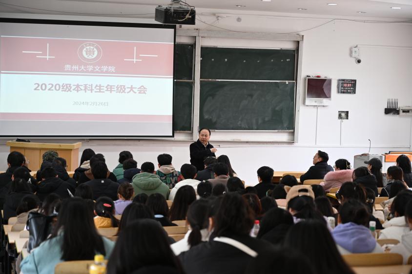 2023年2月26日中午,贵州大学文学院在逸夫楼515DT召开2020级本科生新学期年级大会。学院党委书记李开学、中文系教师彭兴滔、本科生思政辅导员曹家鹏及全体2020级本科生参加会议。会议由曹家鹏主持。
