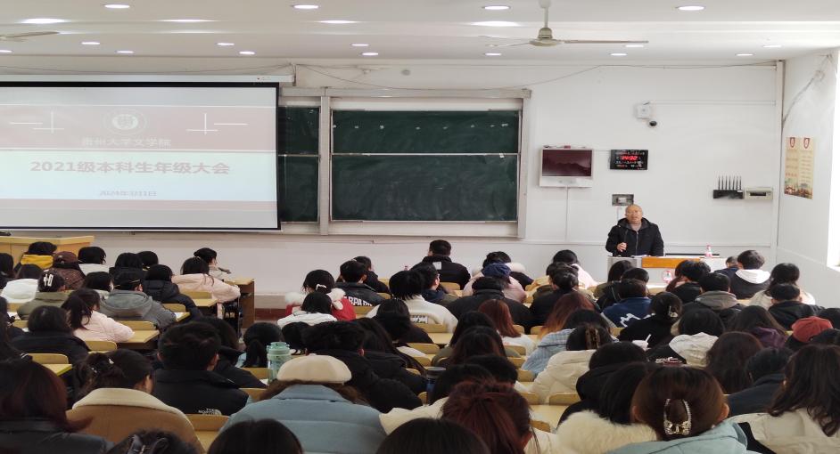 2024年2月29日下午,贵州大学文学院在逸夫楼515DT召开2021级本科生新学期年级大会。学院党委书记李开学、副书记院长谭德兴、本科生思政辅导员罗兰、曹家鹏及全体2021级本科生参加会议。会议由李开学主持。