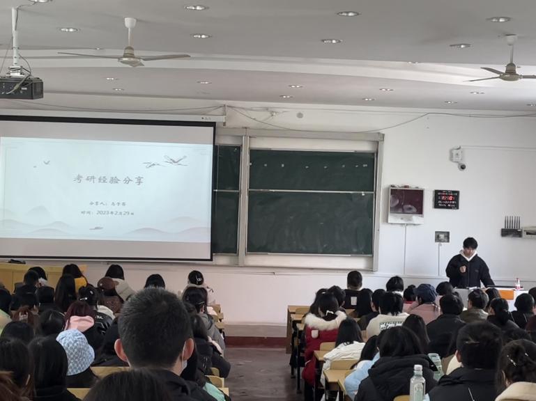 马子昂、黄林英向同学们分享了考研经验。他们说:政治复习,记诵是第一基础,同学们在用好手中复习资料的同时需要不断地总结和复盘,形成属于自己的一套答题模版。英语复习,同学们要重视积累,提高自身单词储备量,用好真题资源,注重提高自身效率,让考研事半功倍。专业课复习,同学们切忌囫囵吞枣,应该全面细致地把专业书吃透、学精,方便后期总结与查缺补漏。在整个考研复习中同学们需要提高自觉性,将对未来的展望内化成自身驱动力,同时注意调节心态,不疾不徐地向考研目标前进。