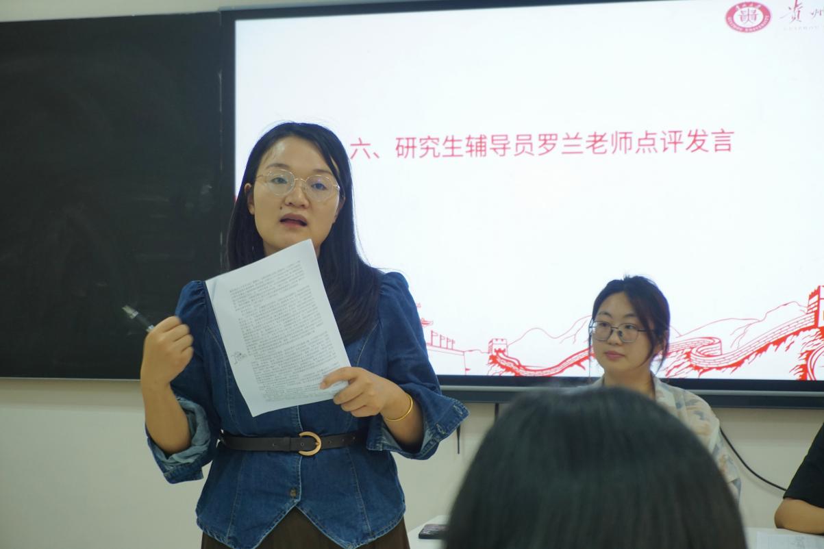 文艺学2023级汤美琪、文字学2023级宋玉英进行了讨论发言。汤美琪表示,通过学习习近平总书记对思政课的重要指示精神,深刻认识到思政教育在新时代的重要地位和作用,我们应坚定理想信念和掌握扎实的专业知识并结合专业优势为思政教育的创新与发展贡献力量。宋玉英表示未来若是从事教师职业,将以习近平总书记对学校思政课建设的重要指示精神为指导,努力培养更多让党放心、爱国奉献、担当民族复兴重任的时代新人。