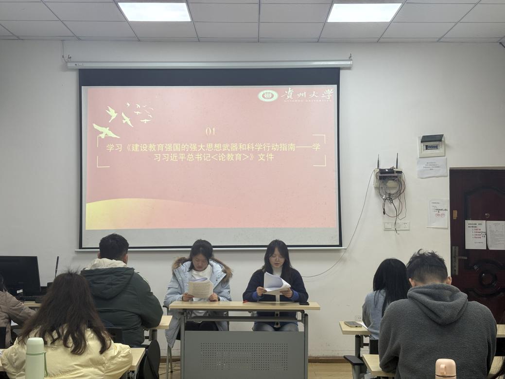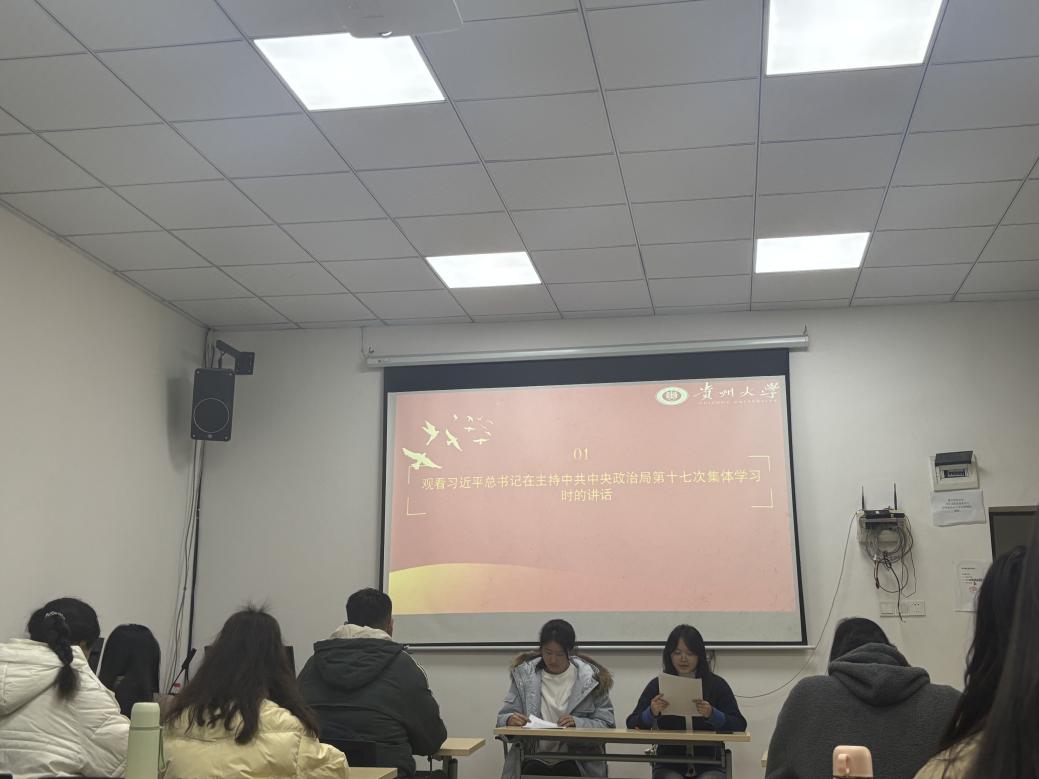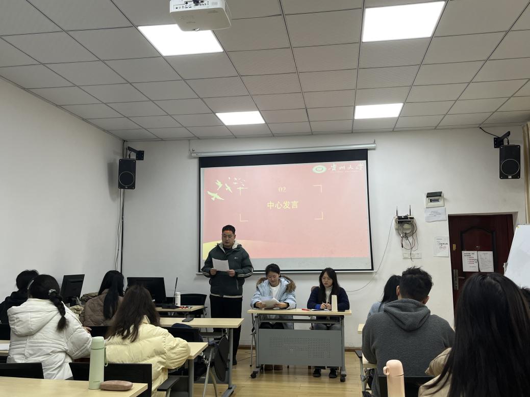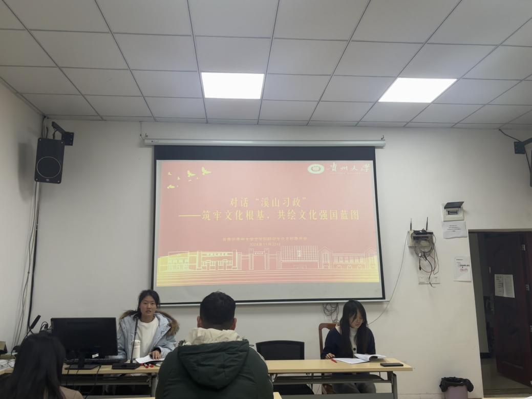 2024年11月22日,共青团贵州大学文学院研究生总支部委员会在人文楼103教室组织开展“筑牢文化根基,共绘文化强国蓝图”主题溪山习政理论学习活动。2024级研究生参加此次学习,活动由文学院研究生团总支副书记张雯主持。