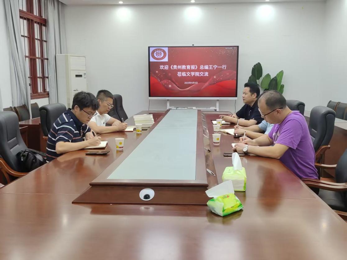 9月5日,文学院与《贵州教育报》在人文楼104召开交流会议,《贵州教育报》总编王宁一行、文学院党委书记陈爱东、副书记副院长赵永刚、教学科研科科长郭付利等出席会议。
