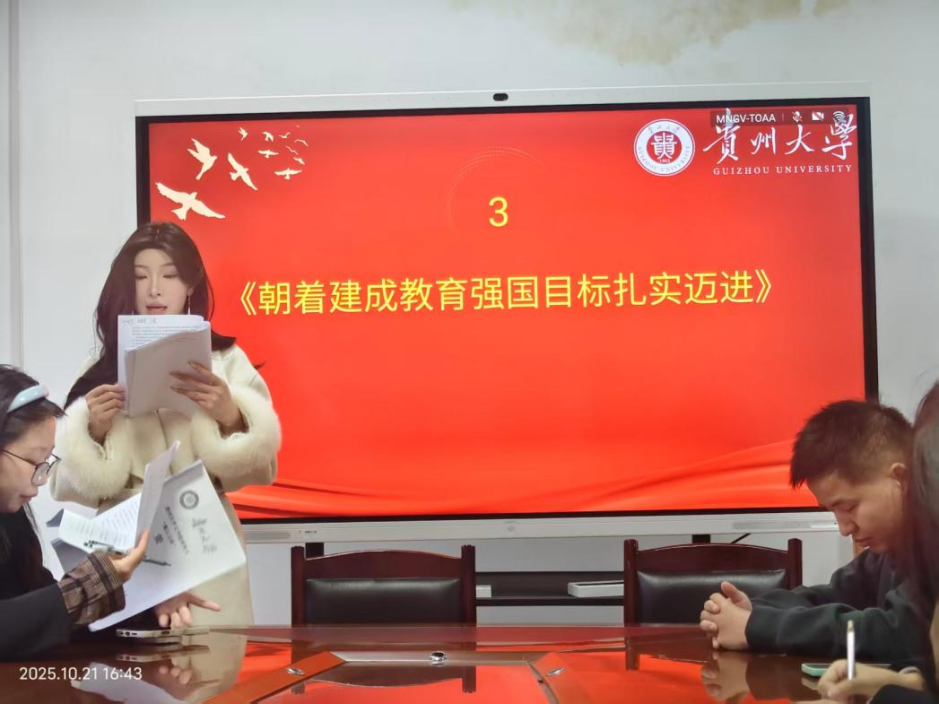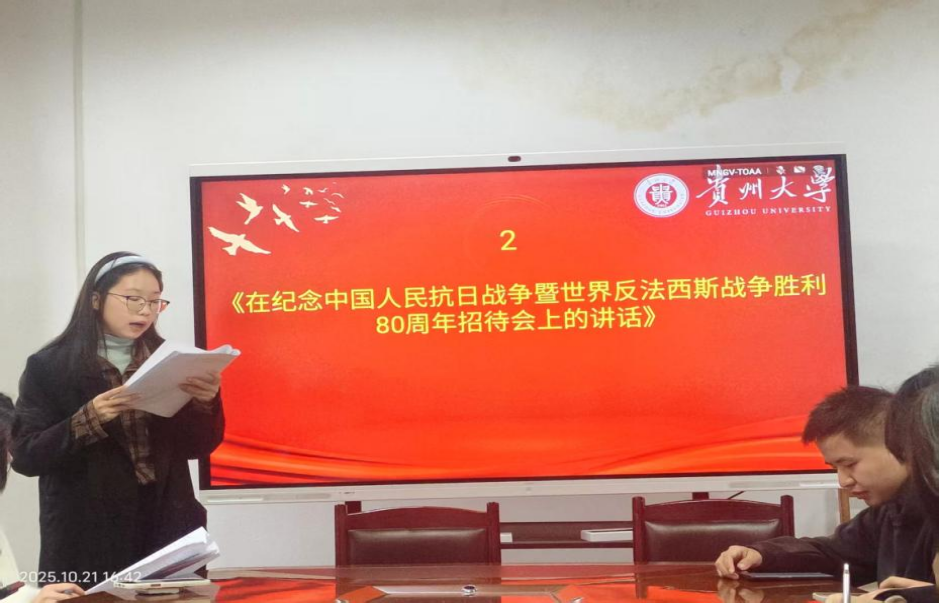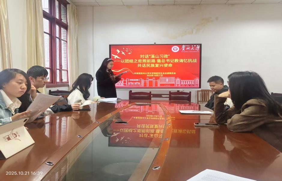 2025年10月21日,共青团贵州大学文学院研究生总支部委员会在人文楼204教室组织开展“以团结之炬照前路 循总书记教诲忆抗战 共话民族复兴使命”主题溪山习政理论学习活动。2025级全体研究生参加此次学习,会议由文学院研究生团总支书记贺诗洋主持。