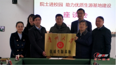 宋宝安一行在铜仁一中书记李茂潮,党委副书记、校长舒崇进的陪同下参观了铜仁一中“院士柱”,并与高三学生一起栽种“院士树”。随后双方在学校会议室进行座谈,并为铜仁一中“贵州大学优质生源基地”揭牌。