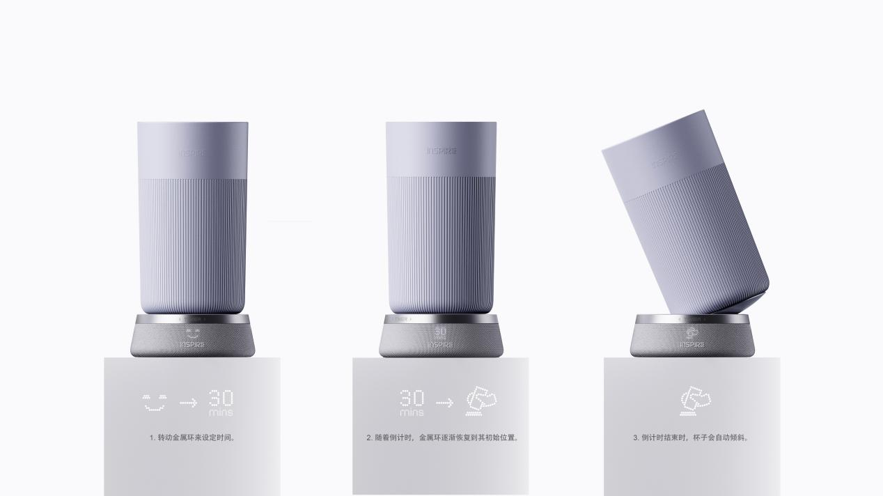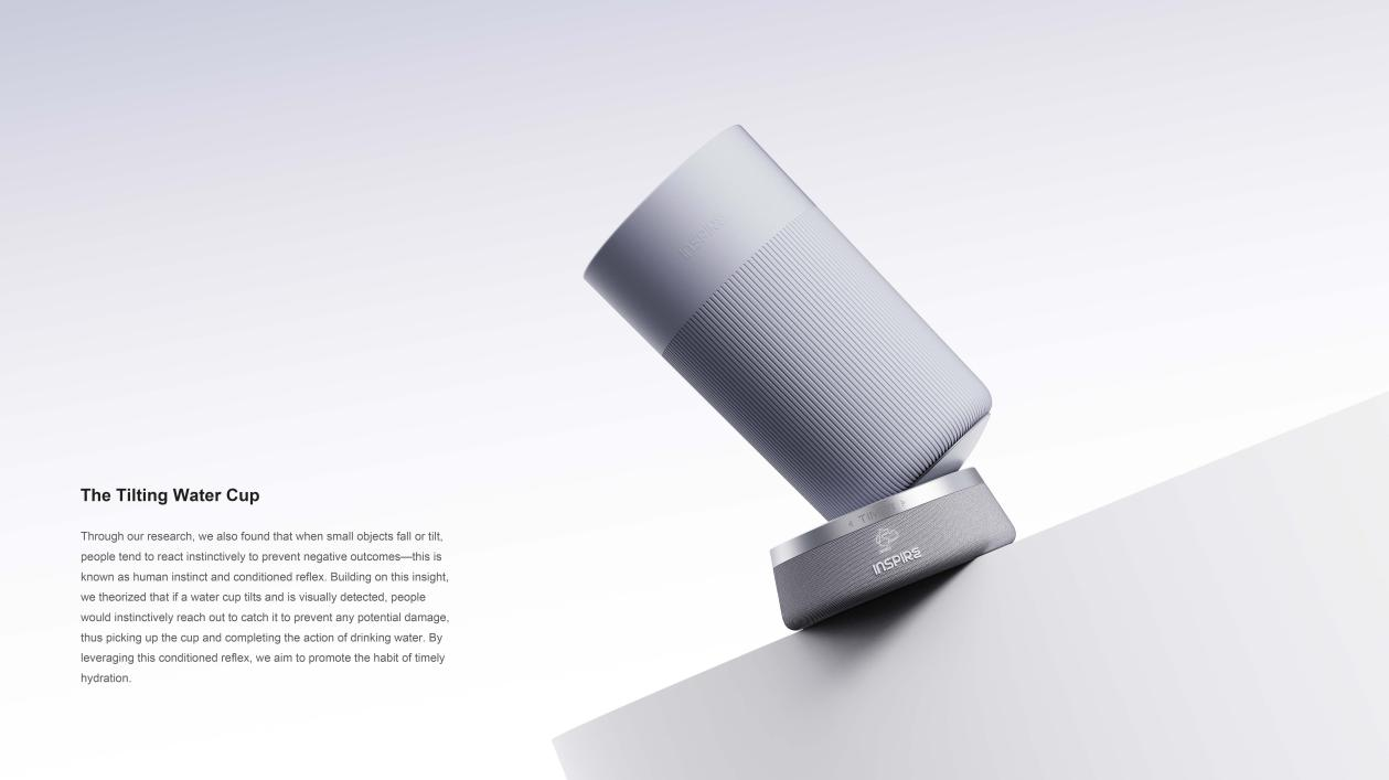 Red Dot Award: Winner获奖作品《倾倒水杯The Tilting Water Cup》 在快节奏的生活中,人们常常忘记喝水。对年轻人习惯的研究表明,繁忙的工作和学习日程可能会导致脱水,影响新陈代谢并引起头痛及疲劳等问题。为解决年轻人喝水少问题,设计了这款倾倒的水杯。研究显示,闹钟等简单的提醒经常被忽视。相反,人们更有可能在看到物体倾倒时作出反应。这一反应激发了我们的设计灵感:“一个看似在倾斜的水杯”。当用户伸手去抓时,他们自然会拿起水杯,以此来培养用户喝水习惯。