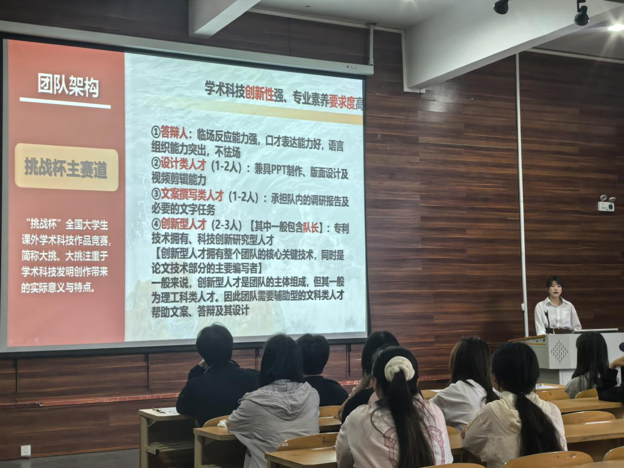 陈钰围绕学习、生活、科研比赛等方面进行经验分享,尤其在参加竞赛分享环节,借助详细的表格,将各类竞赛信息清晰呈现,从竞赛名称、参赛要求到备赛要点,毫无保留地为同学们讲解,让大家对各类竞赛有了更全面深入的认识,极大激发了同学们参与竞赛的热情。 在学习经验分享中,陈钰谈到制定阶段目标与建立知识体系的重要性,建议同学们制定适合自己的学习计划,定期总结复盘,提升学习效率。生活方面,她分享了如何平衡学业与个人生活,鼓励大家积极参与校园活动,拓展社交圈,丰富大学生活体验。