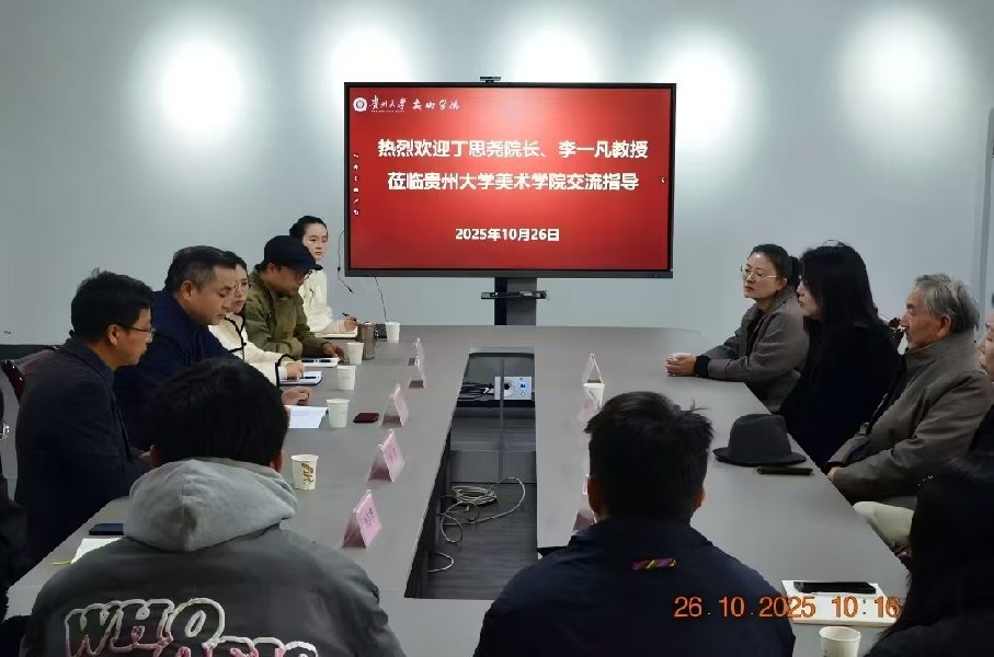 10月25日,中国人类学民族学研究会民族文化创意产业专业委员会2025年学术年会暨贵州大学《中华民族共同体概论》教学交流研讨会在贵州大学举行。 10月26日,与会专家佳木斯大学美术学院丁思尧院长、北京印刷学院新媒体学院李一凡教授、中国人类学民族学研究会民族文化创意产业专业委员会副主任王滨等莅临贵州大学美术学院交流指导。贵州大学美术学院院长唐昌乔教授主持会议,贵州大学学报艺术版、品牌设计研究中心、文创产品设计中心、相关专业师生代表参加。唐昌乔介绍了贵州大学美术学院未来发展的三个重点方向,参会人员围绕数字时代艺术新形态,艺术赋能区域经济社会发展、应急科普信息设计、文化创意成果转化、学科建设及人才培养等方面开展深入研讨,进一步加强了院校合作,吸收并借鉴相互好的经验和做法。