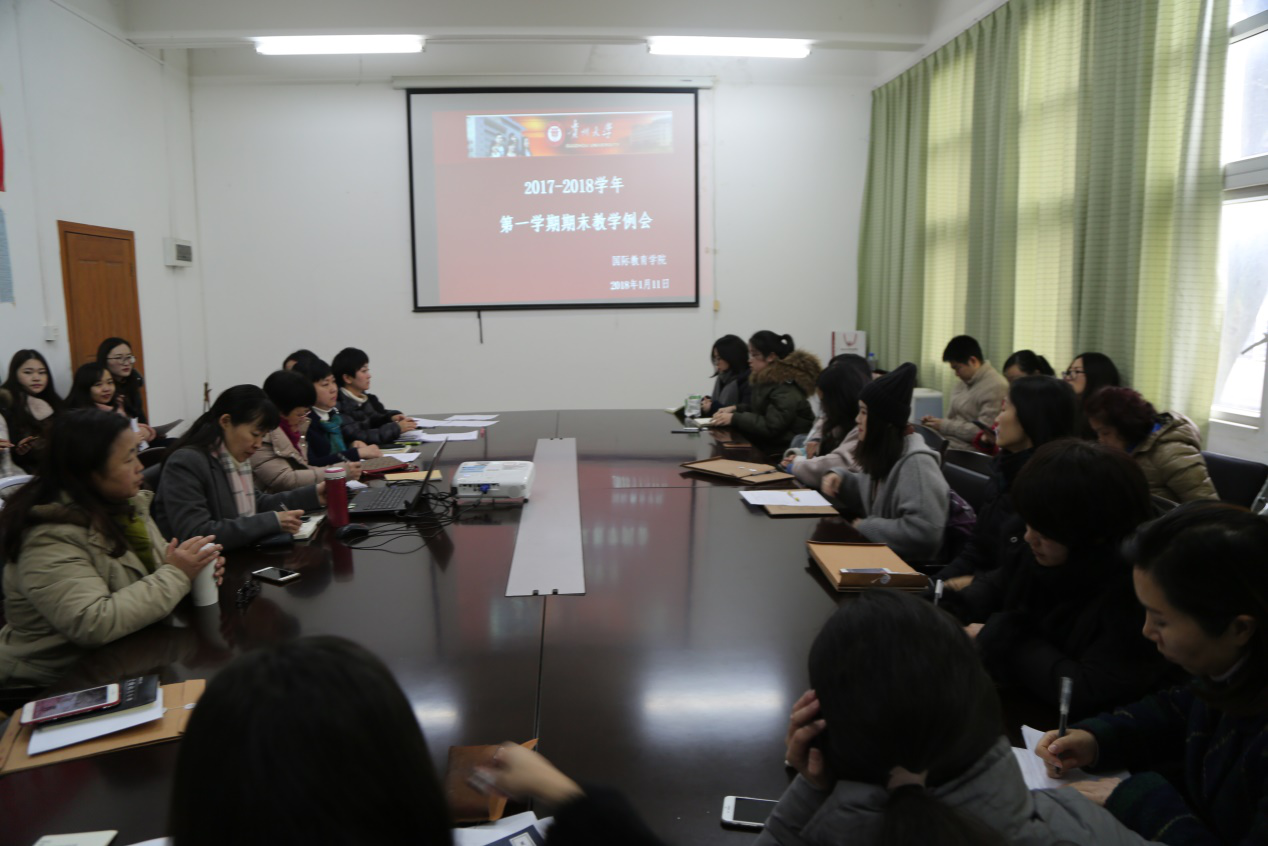 2018年1月11日,我院在二楼会议室召开了2017-2018学年第一学期期末教学例会。国际教育学院党委书记凌琦、院长张成霞、副院长梁雪出席了本次例会。国际教育学院教学科研科科长唐颖、对外汉语教研室负责人钟晓路以及本学期全体对外汉语教师参加了会议。