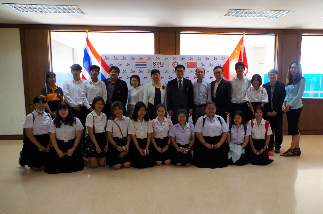 2018年1月31日上午,在斯巴顿大学-春武里校区人文学院院长Montree Polyium和汉语教师Sirilap Ruangjarernlap的引荐下,贵州大学代表团来到春武里Chonburi Sukkabot高中,重点推荐贵州大学-斯巴顿大学“1+2+1”商务汉语联合培养项目。该校目前有2000多名学生,高中、初中部都开设有汉语课程,学习汉语的学生有250多名,有3位汉语教师和一位志愿者。该校负责人及与会人员表示将积极宣传贵州大学,并将极力推荐学生毕业后报考贵州大学。