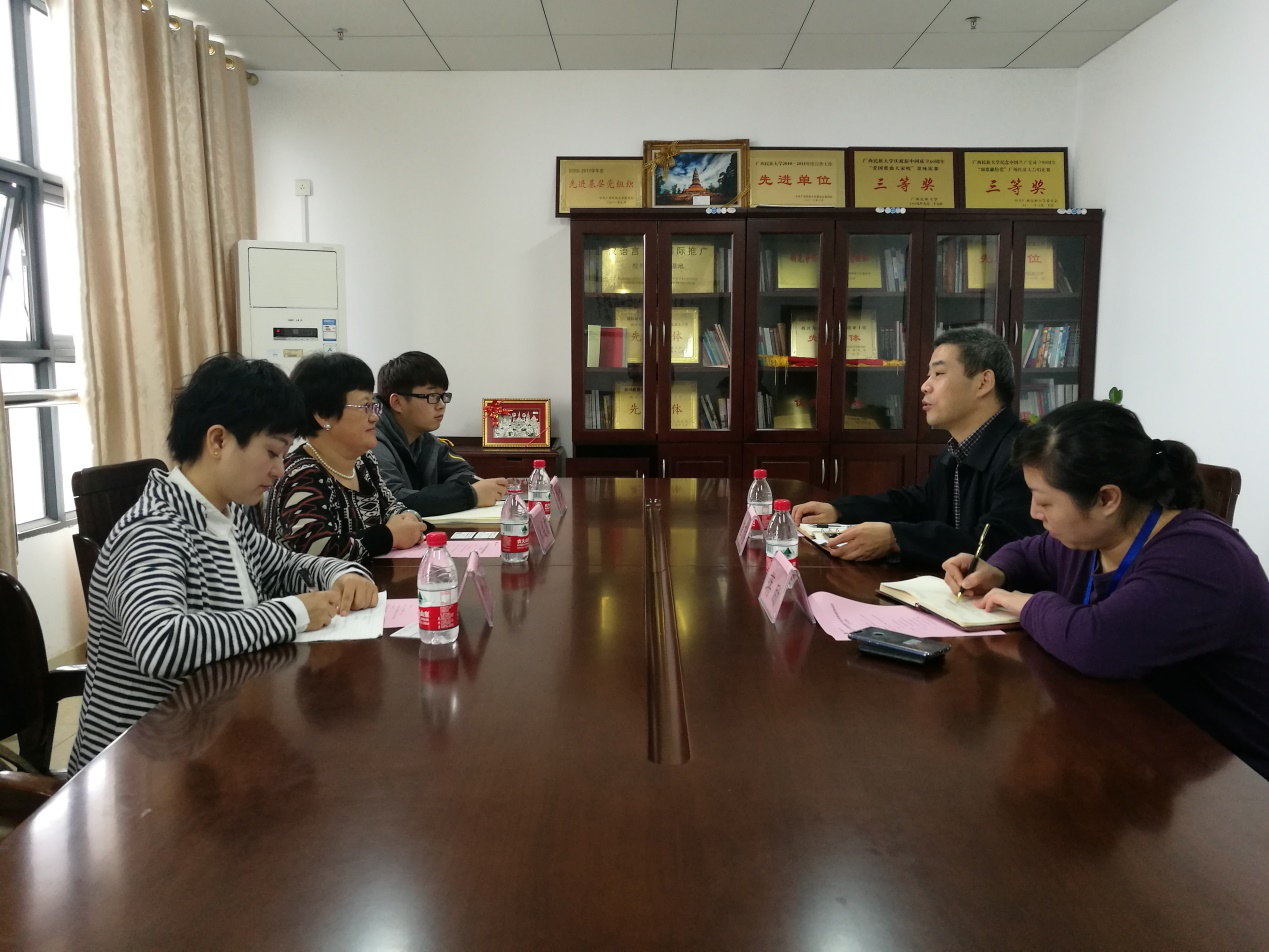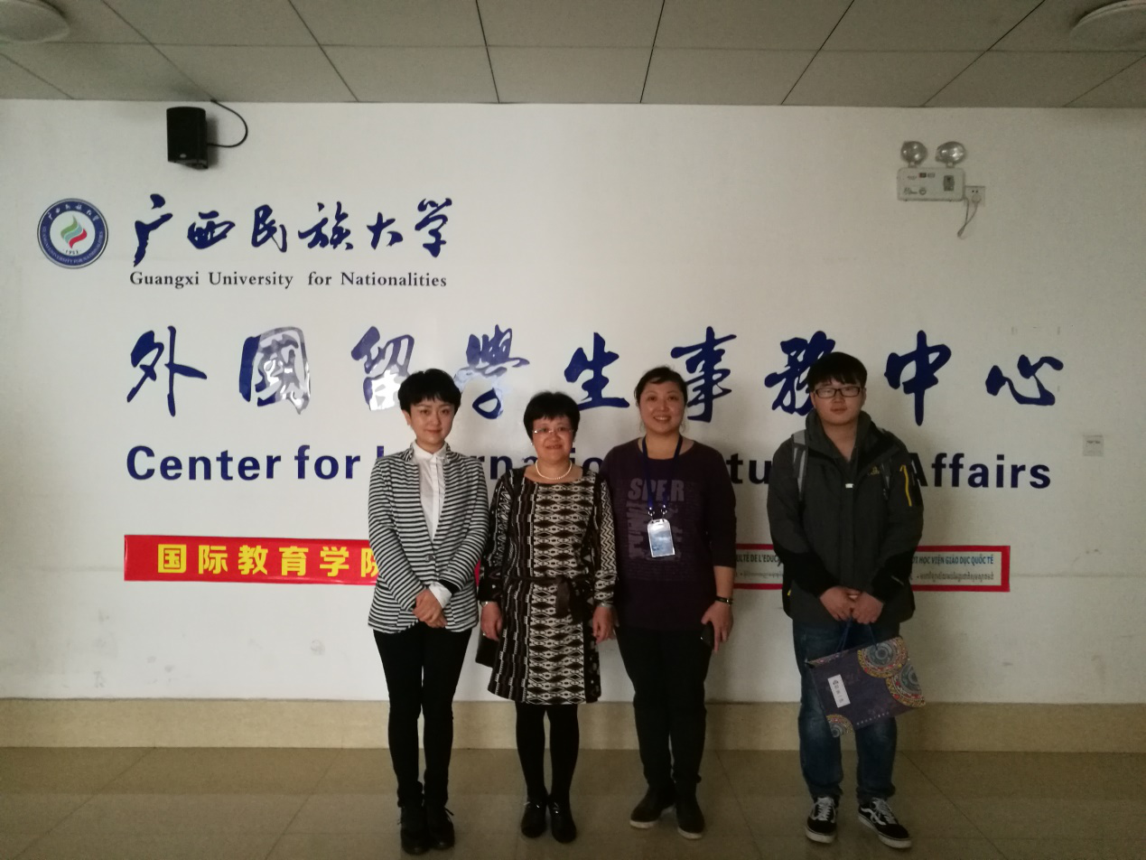2017年11月30日,国际教育学院院长张成霞带领学院教学科研科科长唐颖、留学生管理科辅导员李博一行前往广西民族大学国际教育学院进行考察。广西民族大学国际教育学院院长崔万安、副院长蒋励接待了出访一行。