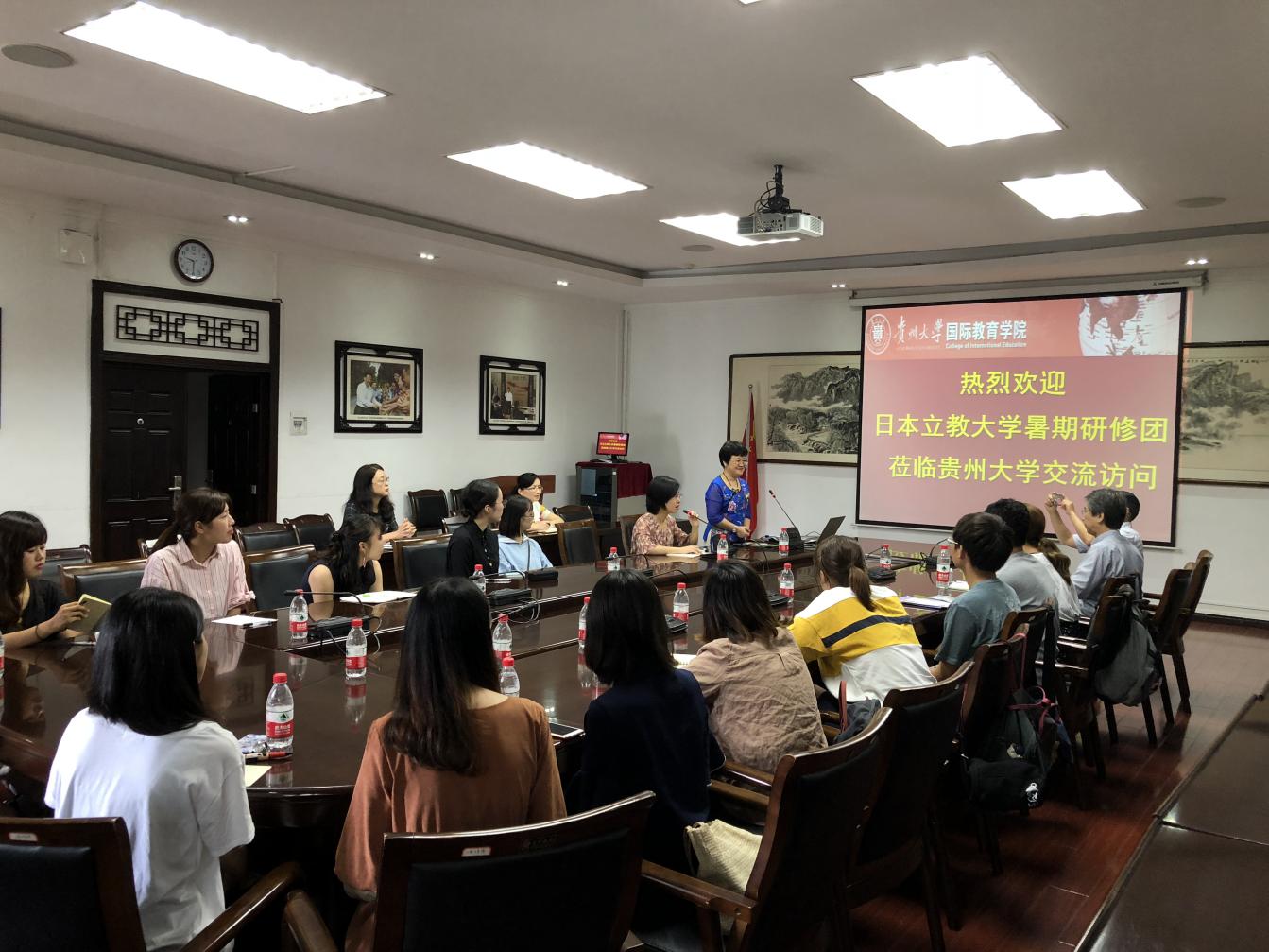 张成霞院长对暑期研修团的到访表示热烈的欢迎,并向成员介绍了贵州大学的历史和发展现状、国际教育学院概况及留学生丰富多彩的留学生活。张院长倡议两校在师生交流、特别是旅游人才培养方面进行深入合作。暑期研修团的带队老师——日本立教大学观光学部舛谷锐教授,也希望两校今后能进一步加强合作,组织开展学生国际交流项目,共同为促进和加深中日两国之间,特别是年轻学生之间的跨文化沟通与理解做贡献。