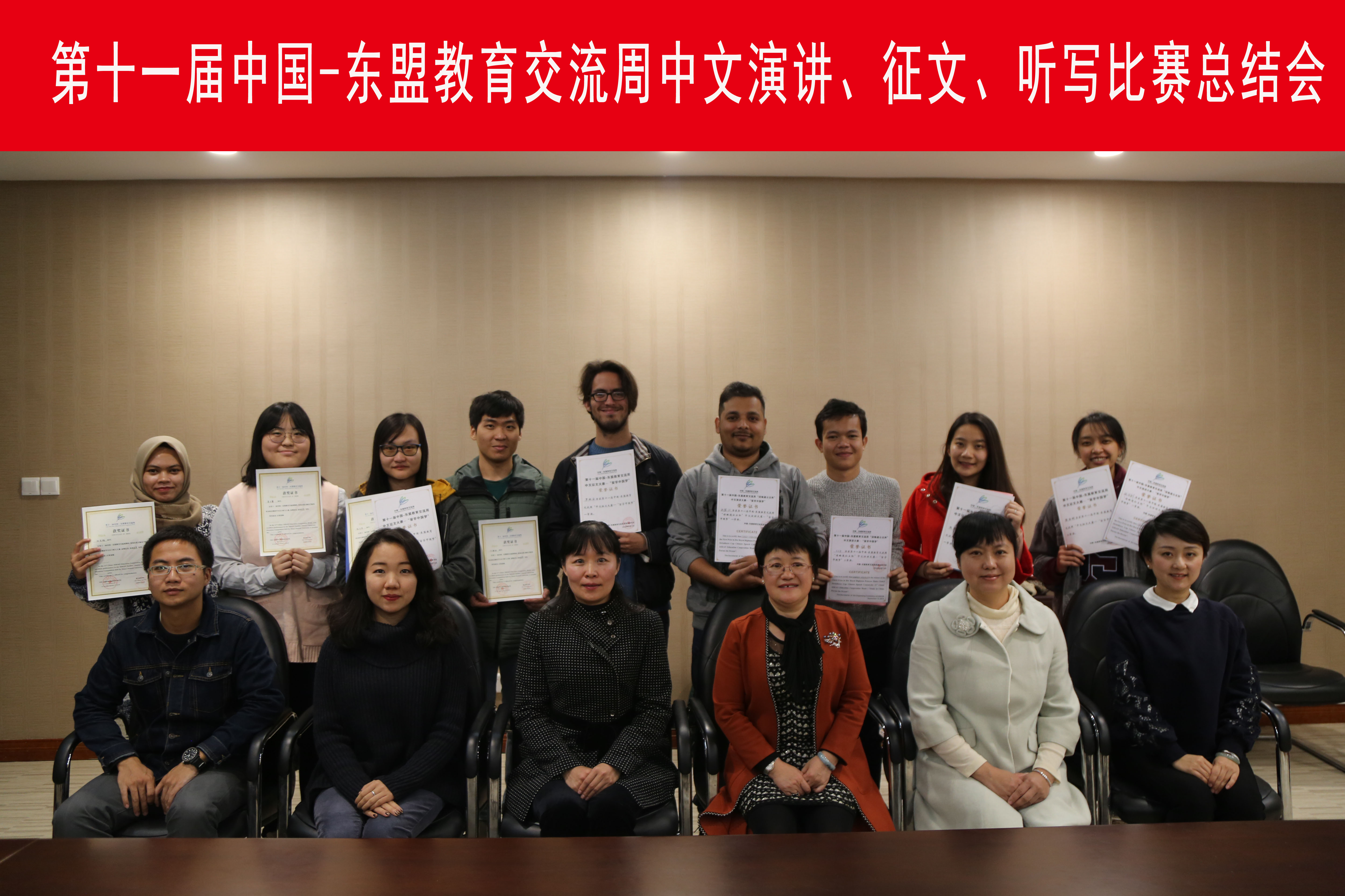 在第十一届中国-东盟教育交流周“诗琳通公主杯”中文演讲大赛暨征文大赛——“留学中国梦”中,我院张金树(老挝)《缘起中国茶》、张德江(印度)《我的梦想与中国》获得演讲大赛一等奖,可马里(老挝)《走进中国放飞梦想》获得演讲大赛三等奖。我院唐颖、钟晓路、梁玉豪被评为优秀指导教师。在征文大赛中,罗杜安(哥伦比亚)《梦想的故事》、阮翠恒(越南)《一个越南女孩儿的中国梦》荣获一等奖,张金树(老挝)《缘起中国茶》荣获二等奖,陈文萍(柬埔寨)《我的华校梦》荣获三等奖,王玉华(柬埔寨)《我的中国留学之路》荣获优秀奖。我院唐颖、钟晓路、梁玉豪、侯良迪被评为优秀指导教师。在第十一届中国—东盟教育交流周东盟留学生汉字听写大赛中我院东盟留学生代表获得团体优秀奖,陈文萍(柬埔寨)、叶健财(印度尼西亚)、姜主睿(韩国)、任妮雅(印度尼西亚)四名参赛选手均获得个人优秀奖。