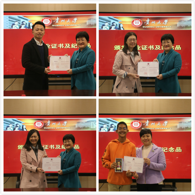 贵州大学国际教育学院院长张成霞、副院长梁雪及教学科研科科长唐颖出席,泰国万里通语言学校中方校长吴振文、泰方校长NONGNUCH CHEEWASRIRUNGRUANG、清迈大学附属中学中文老师RUJIRA LEE及13名来自泰国的学生参加了本次结业典礼。结业典礼由国际教育学院梁雪副院长主持。