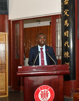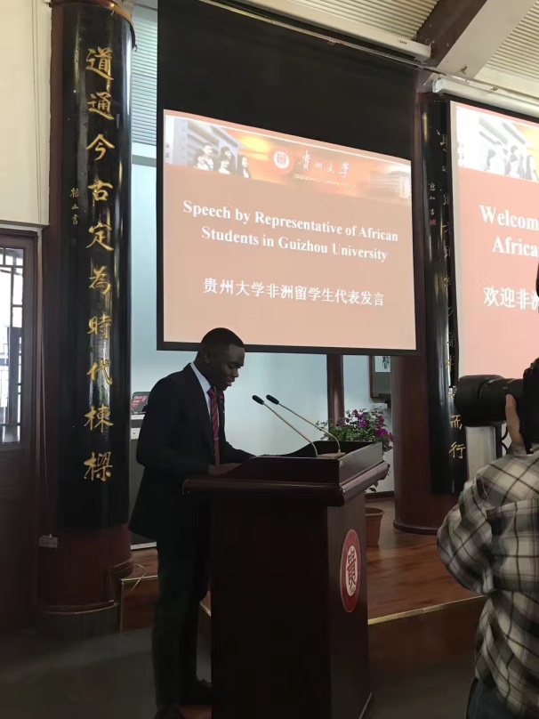 刚果(布)留学生达石代表非洲留学生发言。他讲到,来到贵州学习,不仅欣赏到了中国西部美妙的自然人文风光,还在中国一流的高等学府里接受了最好的教育,在良好的平台展示自己、挑战自己、提升自己。将珍惜难得的学习机会,用丰富多元的知识和文化创造更加美好的未来。