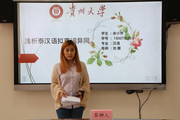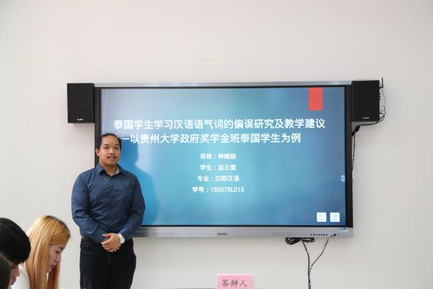本次答辩委员会成员为贵州大学文化与传媒学院黄海教授,贵州大学国际教育学院晋克俭书记、张成霞院长,贵州大学国际教育学院刘薇老师、钟晓路老师以及梁玉豪老师。答辩人为2015级贵州大学-泰国清迈北方大学“交际汉语”项目生六人。
