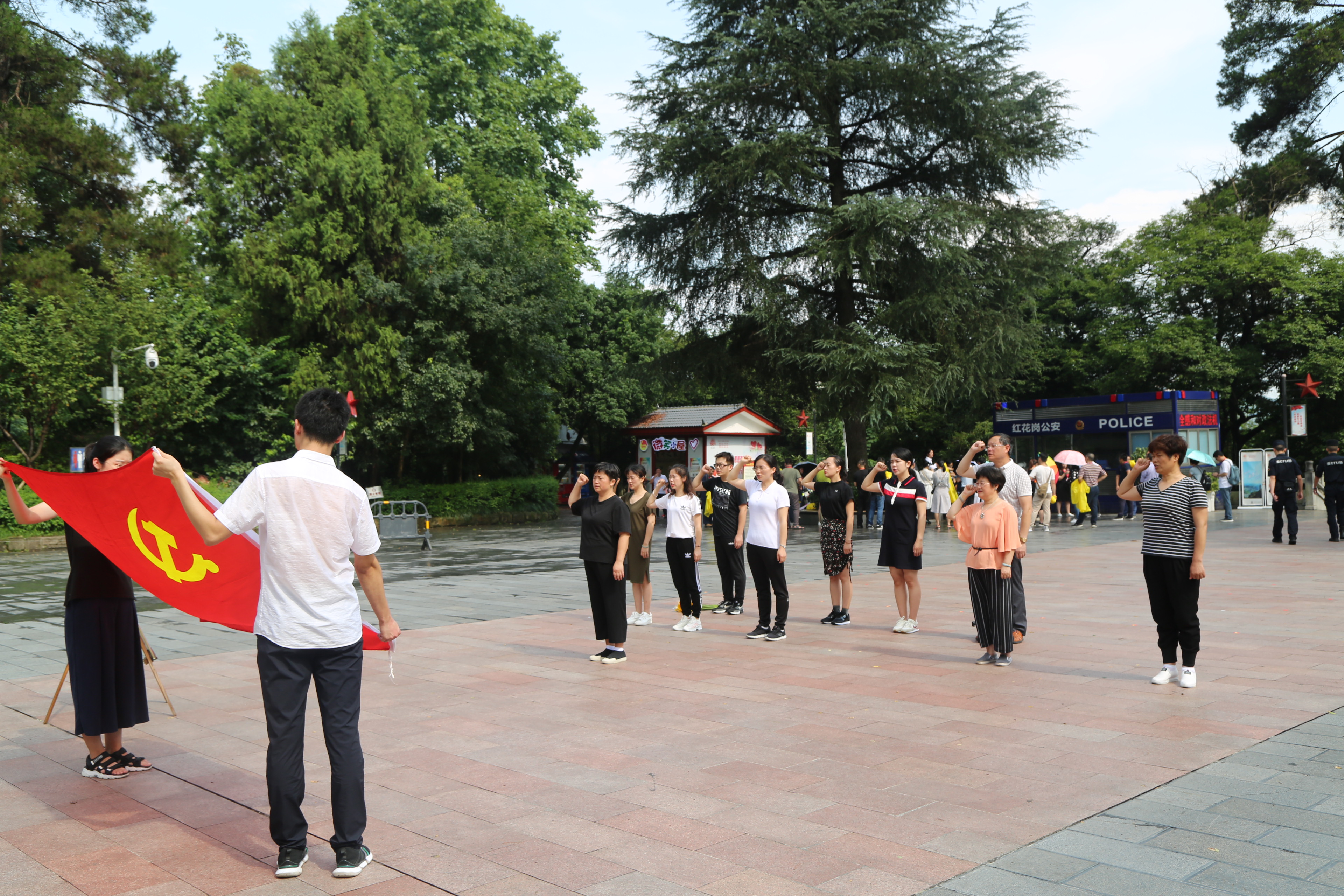 参观完会址,微风细雨中,大家步行至红军山,在满山青松翠柏中拾级而上。来到烈士纪念碑前,纪念碑上邓小平同志手书的"红军烈士永垂不朽"八个金色大字庄严肃穆。全体党员面向纪念碑,郑重地三鞠躬,并在党委书记晋克俭同志的带领下,重温入党誓词。“我志愿加入中国共产党,拥护党的纲领,遵守党的章程,履行党员义务,执行党的决定,严守党的纪律,保守党的秘密,对党忠诚,积极工作,为共产主义奋斗终身,随时准备为党和人民牺牲一切,永不叛党”,党旗鲜红,誓言铮铮,鞭策着党员们不忘入党初心,牢记肩上的责任和使命。最后,大家一一走到纪念碑前献花,缅怀革命先烈。
