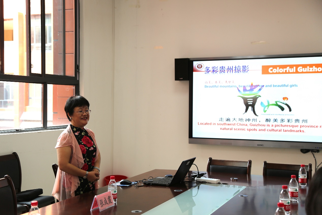 开班典礼后,国际教育学院院长张成霞为交流团的师生做了贵州省情和贵大校情介绍。通过图片和视频的放映,直观、生动的对贵州省的基本情况、地理环境、生态资源、物产种类,以及贵州大学的周边环境、特色课程、文化活动、合作交流以及留学生项目等进行了展示。