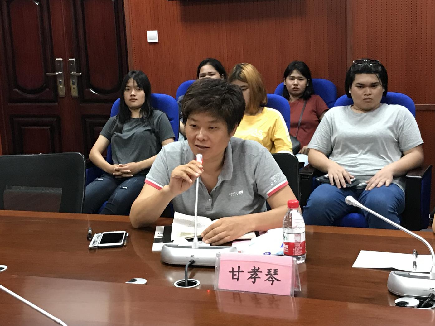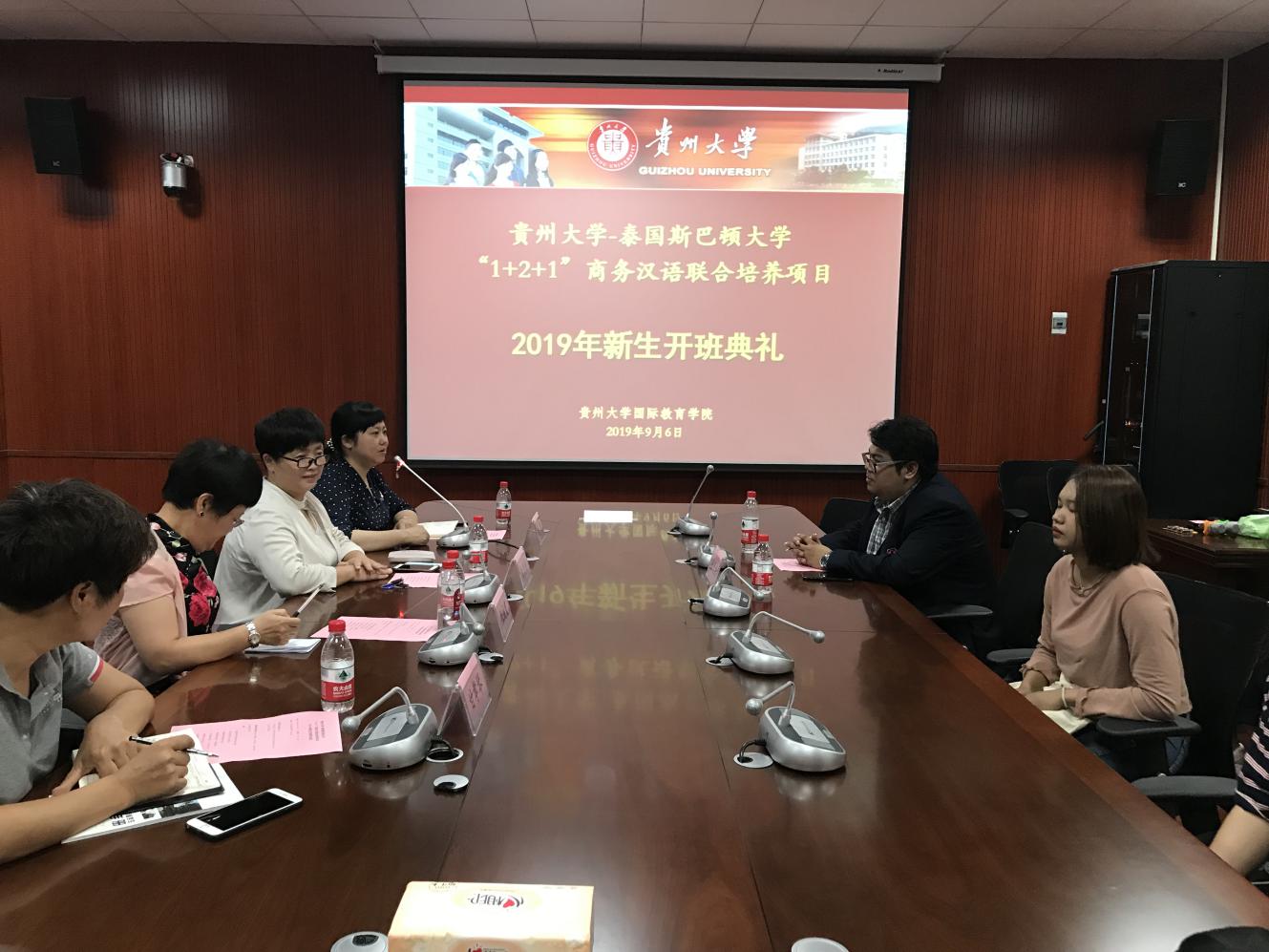 2019年9月6日下午,“贵州大学-泰国斯巴顿大学联合培养项目”2019级新生开班典礼在学校明正楼5楼东盟研究院会议室举行。贵州大学国际教育学院党委书记晋克俭、院长张成霞、副书记甘孝琴、副院长梁雪、泰国斯巴顿大学(春武里校区)文学院商务汉语系主任张天龙,以及来自泰国斯巴顿大学的23名项目学生参加了开班典礼。