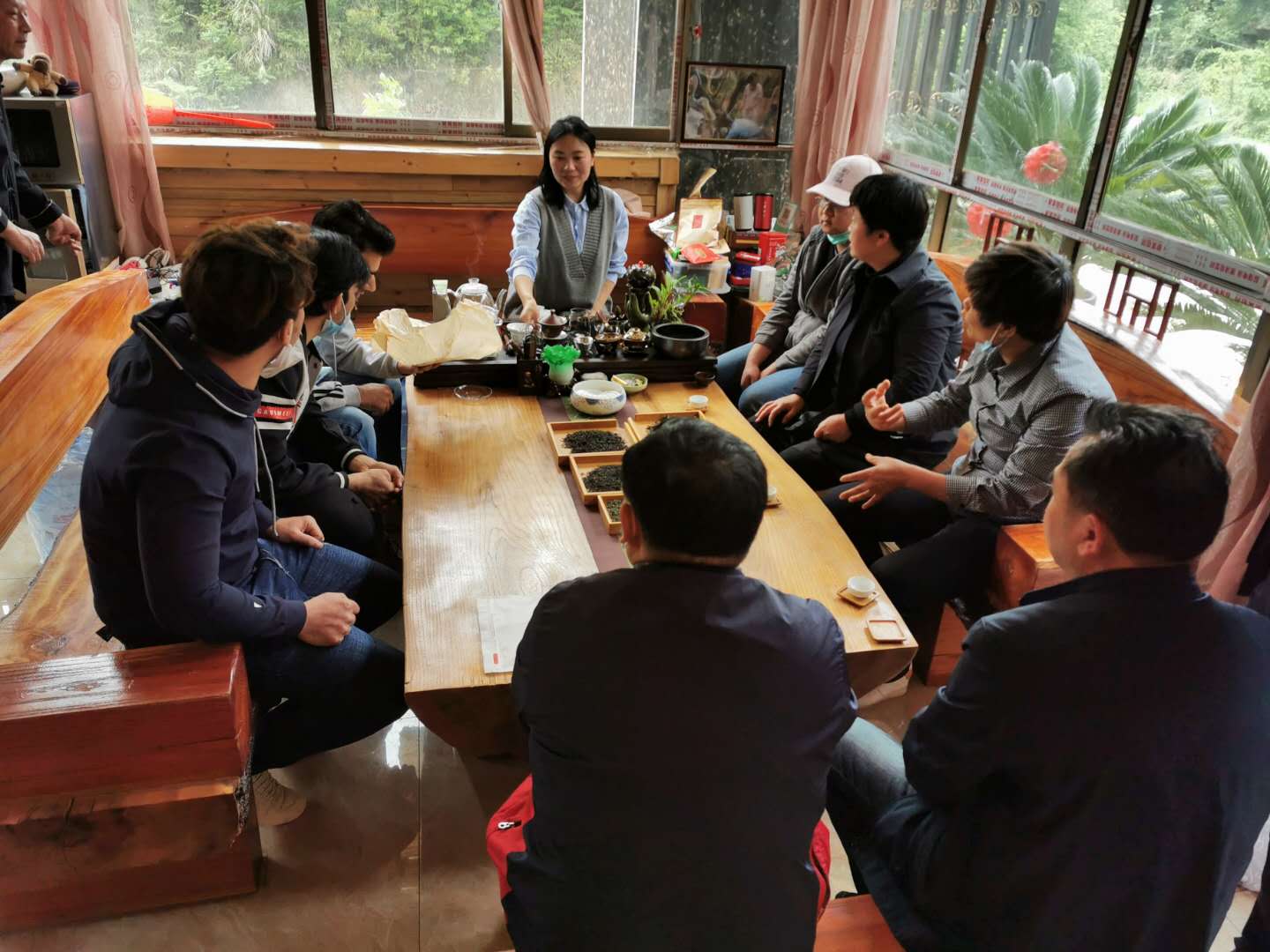 随后大家在品茶室品尝了不同种类的茶汤。品尝过程中,该公司负责人金毅老师讲述了燕楼镇古茶树群,野生小叶灌木型茶树的基本情况。介绍了该茶产业助力了当地经济社会发展,为当地农民、贫困户搭建就业平台,增加农民收入,实现自主脱贫。