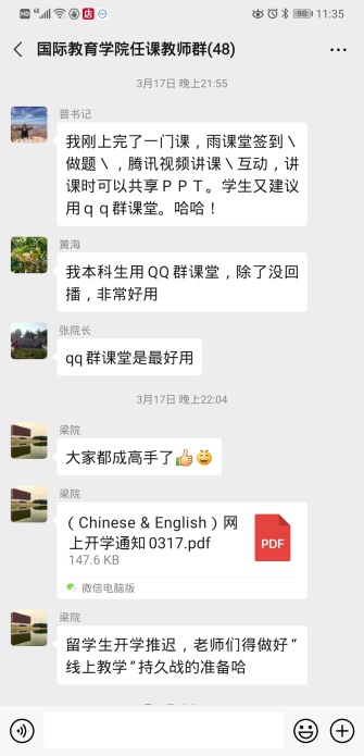 开课前,国际教育学院教学科研科对全院所有对外汉语教师进行了线上课程教学培训,各类课程建立微信教学群或QQ教学群,采取“一课一班一群”,保证学习效果。