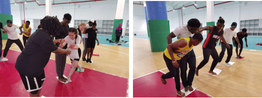 最后的集体项目是“过河”,同学们4人一组,每组分到了3张纸,同学们要踩着这3张纸慢慢往前挪,脚还不能踩到纸外,率先到达终点的小组“过河”成功。这时候就考验大家的协作能力了,要手拉手,肩并肩,互相“拉扯”,才能取得团队的胜利。