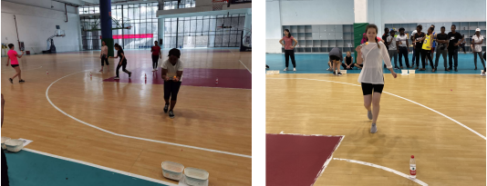 此次活动共有4个项目:踢毽子、跳绳、筷子夹乒乓球和团队项目“过河”。尽管天气炎热,留学生们依然兴致盎然,趁比赛还没开始争分夺秒地进行热身。比赛的哨声一响,大家立刻投入到激烈的比拼中:有单脚踢毽子的,也有左右脚互换着踢的,还有的踢着踢着离比赛场地越来越远······有的同学跳绳十分厉害,一分钟跳150个也不在话下,也有同学则不慌不忙,一秒一个,引得围观的同学们哈哈大笑,又止不住地为他们加油鼓劲。