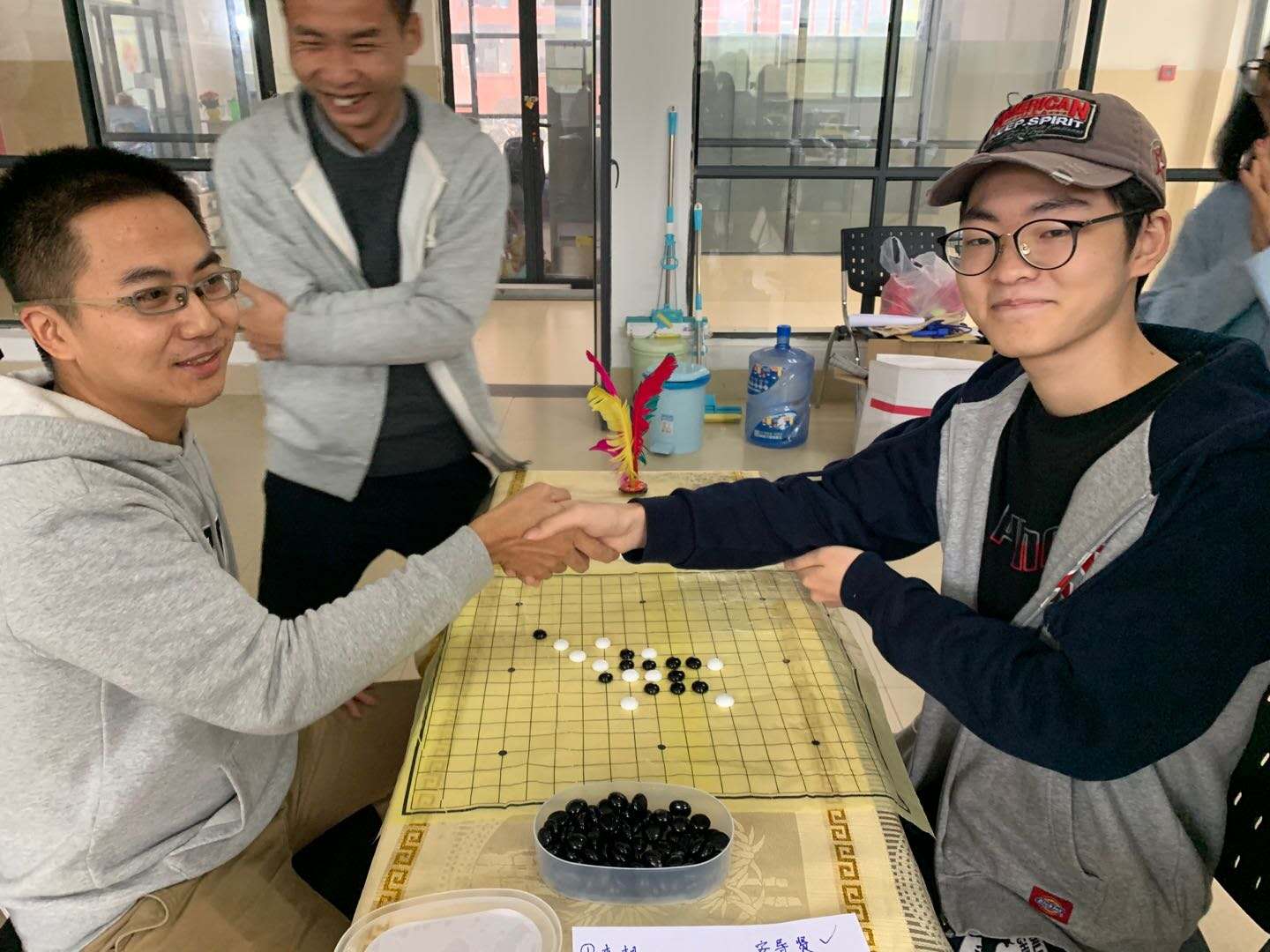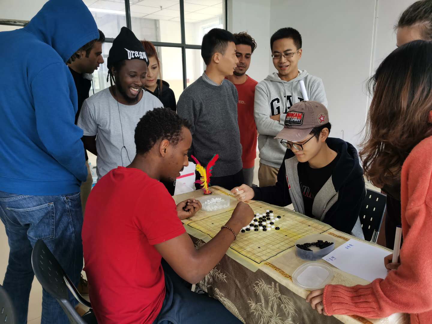首先开展的是五子棋比赛,比赛氛围充满紧张和欢乐,有的因赢得比赛而握紧双拳,有的为遗憾出局而咬紧牙关,通过厮杀比拼,最终来自韩国的安导贤过五关斩六将,以一敌众,获得了最终的胜利。