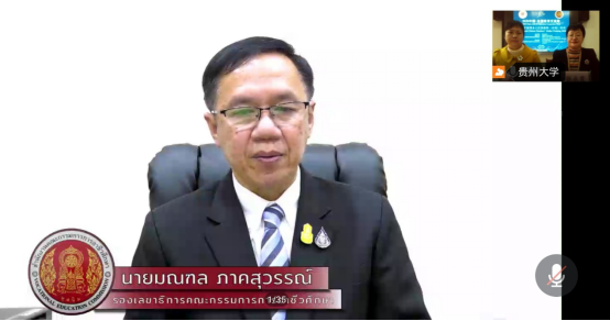 泰国教育部职业教育委员会副秘书长蒙通·帕苏万先生通过视频致辞,他说,此次泰国本土汉语教师在线培训项目此项目是泰国职业教育委员会与贵州大学友好合作的开始。他认为,汉语是世界上使用人数最多的语言,学习汉语,使之成为连接世界的桥梁,是他内心最真实的想法。泰国职业教育委员会是一个培养和发展职业人才的机构,学习汉语让学生所学的知识和语言技能能够在实际生活中得以应用,从而促进了就业。因此,他们特别重视汉语教学,每年都会组织举行泰国本土汉语教师培训项目。期待在不久的将来,能与贵州大学、贵州省、贵阳市乃至中国各个地区展开各种形式的合作。