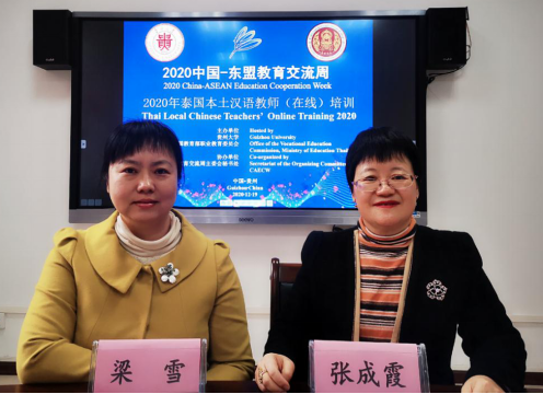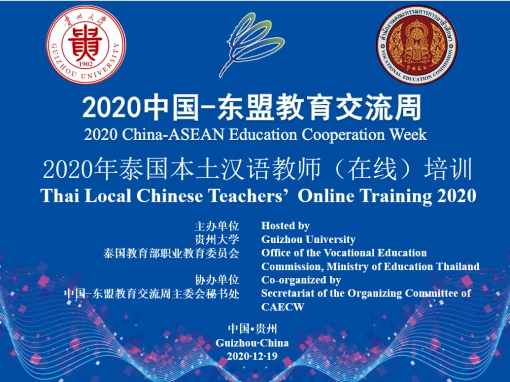 2020年12月19日,由贵州大学与泰国职业教育委员会主办、中国-东盟教育交流周组委会秘书处和泰国万里通语言学校协办的“2020年泰国本土汉语教师(在线)培训”依托腾讯会议平台顺利举行。泰国教育部职业教育委员会副秘书长蒙通·帕苏万先生、泰国万里通语言学校泰方校长徐思梅女士、中方校长吴振文先生、贵州大学国际教育学院张成霞院长,梁雪副院长出席开班仪式,来自全泰国104所公立、私立学校的127位本土汉语教师参加本次在线培训。