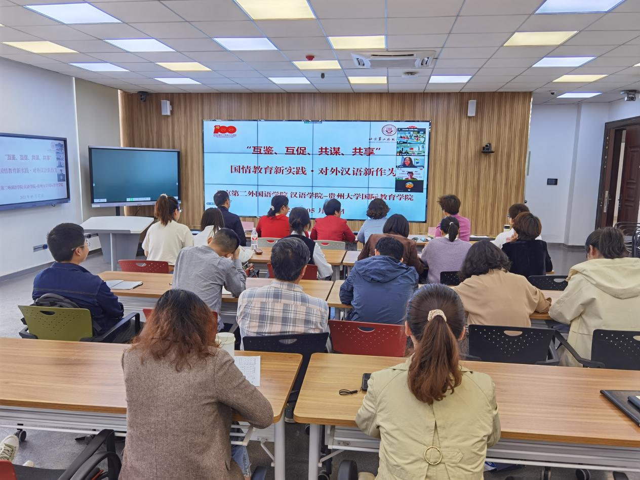 5月17日下午,北京第二外国语学院-贵州大学留学生教育云分享会在西校区德正楼221会议室举行。北京第二外国语学院汉语学院党委书记吴炜、院长于淼、副院长宋飞,贵州大学国际教育学院党委书记晋克俭、院长张成霞及全体班子成员出席会议,双方全体对外汉语教师参加会议。