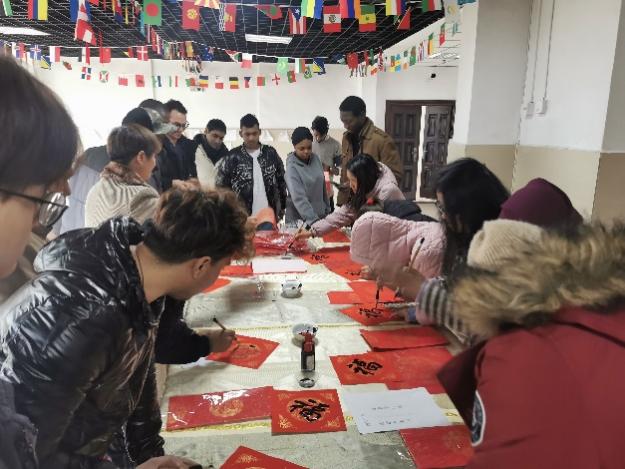 活动最后,师生们一起将印有“迎春接福:春临大地百花艳、节至人间万象新”春联张贴到宿舍大门、电梯等,留学生宿舍在充满寓意美好的春联装点下一片喜庆祥和。