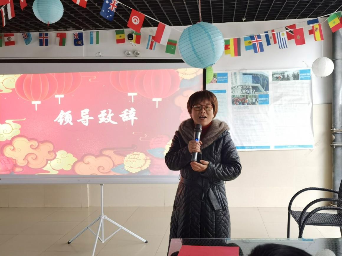 2022年新春到来之际,为让留学生们感受到学校的关怀和温暖,亲身体验中国年味、感知中国文化,1月25日,国际教育学院在留学生公寓面向因疫情一直留在中国境内的留学生开展春节文化体验和慰问活动。贵州大学党委副书记令狐彩桃出席活动,国际交流与合作处处长洪云、国际教育学院党委书记晋克俭、院长张成霞及全体院领导班子成员和在筑教师,与留校28个国家的50余名留学生欢聚一堂,共度农历小年。活动由晋克俭主持。