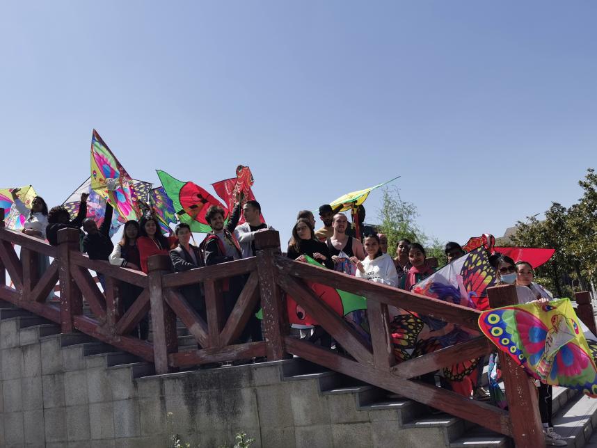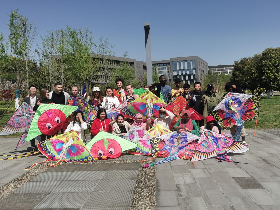 4月3日,春风暖阳正浓时,碧蓝苍穹下,绿亮樱红的贵州大学西校区大门右侧的广场上,留学生同学们正在忙碌着放飞手里的“燕子”“蜻蜓”“笑脸”等各式五颜六色的风筝。正值我国传统节日清明节放假期间,为缓解留学生们因疫情长期不能回国的心理压力,同时,体验我国传统节日清明节的习俗文化——放风筝,国际教育学院组织留学生开展了此次放风筝活动。活动由学院党委副书记甘孝琴带队,辅导员及30余名留学生参与。