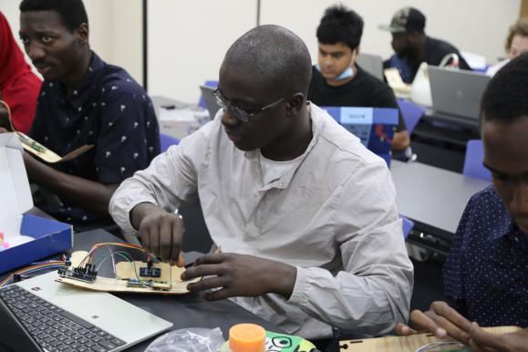 在双创中心,同学们与大厅机器人热情互动,并参观了3D打印馆。紧接着是体验课:无人机体验课上留学生们通过模拟器操作无人机进行障碍飞行,多数同学是第一次,他们表示这项技能真的太酷了!人工智能体验课上在现场教师的指导下同学们完成了微型测距仪的制作,看到自己亲手制作的仪器能够运作,满满成就感。