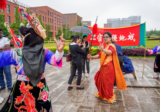 下午是观看屯堡地戏表演。表演者身穿炫目多彩的服饰、头戴狰狞生动的面具、踩着鼓点、跟着嘹亮唱腔起舞,让这充满神秘的地方戏大放异彩,留学生们情不自禁地鼓掌,并纷纷用相机记录下这场难忘的表演。