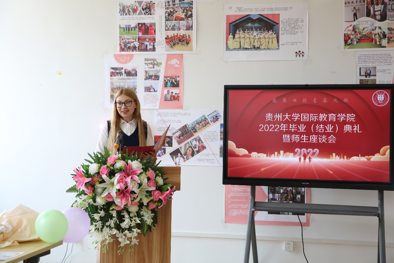 俄罗斯籍留学生缇娅娜、加蓬籍留学生高曼分别代表境内毕业、结业留学生发言。缇娅娜在发言中说道:“我很骄傲,非常骄傲!我骄傲,我来到了中国留学!我骄傲,我是贵州大学的一份子!我骄傲,我在中国认识了如此多优秀和可爱善良的人。对于我来说,这些都是珍贵的人生财富。一辈子都不会忘记! ”表达了对母校浓浓的感念之情。高曼在发言中说道:“我们来自不同的国家,但是在中国,在贵州大学,我们就是一个家庭,我们都是兄弟姐妹,老师就是这个家庭的家长,不断地帮助我们。”表达了对老师的感激、对大学时光的怀念。