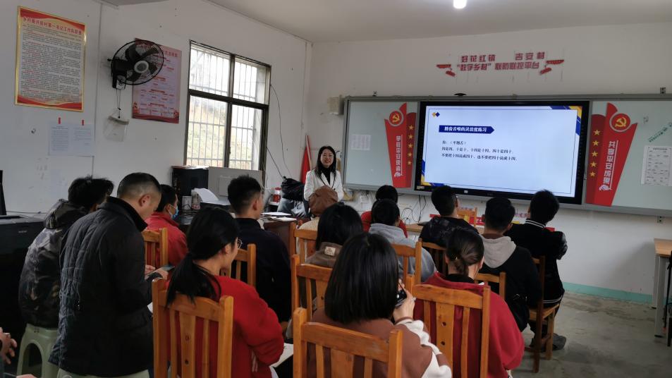 本次培训由我院教师刘薇主讲,培训对象是好花红镇政府和吉安村的青年干部。刘薇老师首先向干部们阐明了说好普通话对于提升干部工作质量、助力当地乡村振兴可持续发展的重要意义。随后,刘薇老师以惠水方言为切入点,从语音、词汇和语法的角度,通过风趣幽默的教学方式指明了普通话和当地方言的异同点,明确了正确发音的要点。